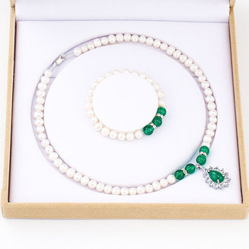Cuentas de perlas de agua dulce para mujer, conjunto de joyería con colgante de Esmeralda y cornalina roja de circón verde, collar y pulsera