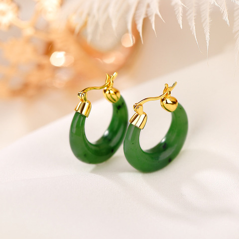 925 Sterling Silver Retro Cổ Chunky Hetian Ngọc Hoop Bông Tai Trang Sức Màu Xanh Lá Cây Màu Sắc Cho Phụ Nữ